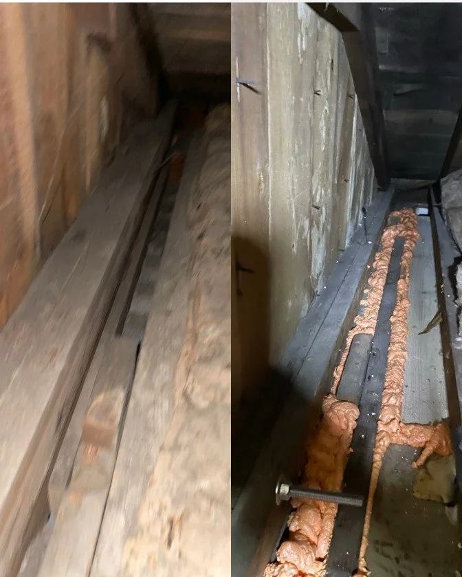 Crawl space rim joist areas were sealed with spray foam to stop air infiltration and the crawl space was insulated. This will help to make the floor above more comfortable and sealing the bottom will help to reduce humidity from entering the home.